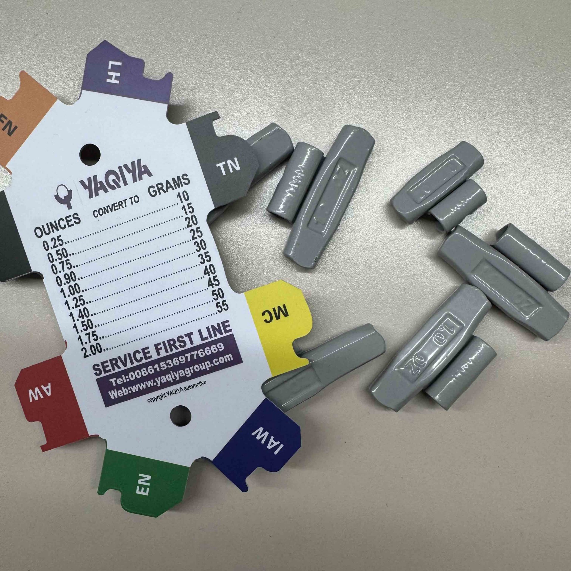This YAQIYA Wheel Weight Clip Gauge is a professional tool designed to quickly identify and match the correct clip type and size for wheel balance weights. It features multiple labeled edges (such as EN, AW, FN, MC, LH, IAW, TN, P) representing different standard clip profiles used for steel and alloy wheels in various vehicle models.